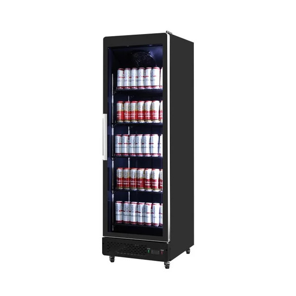 KHP-GDC635R - Üvegajtós hűtővitrin kívül belül fekete belsővel, ventilációs hűtéssel, függőleges LED világítással, ajtózárral és önzáródó funkcióval rendelkezik. A fogantyú rozsdamentes acél. A ventilációs hűtés biztosítja az egyenletes belső hőmérsékletet. A hűtő digitális hőfokszabályzóval, digitális kijelzővel és 4 görgővel szerelt, az első kettő fékezhető.
