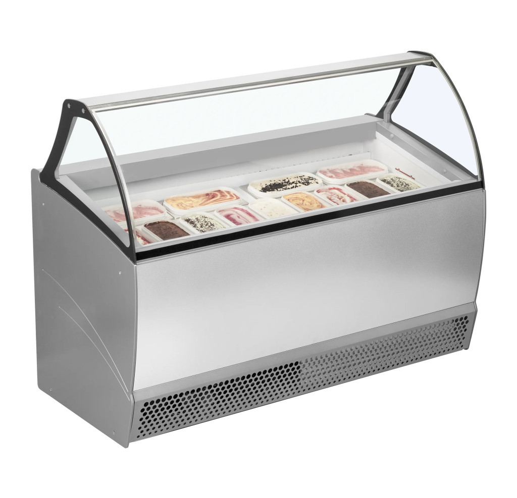 Elegáns megjelenésű, professzionális fagylaltpult ventilációs hűtéssel, amely ideális választás fagyizókba és gelatókba. Az ívelt, fűtött elülső üveg megakadályozza a páralecsapódást, miközben látványosan mutatja be a kínálatot. A szellőztetett hűtőrendszer egyenletes hőeloszlást biztosít, így a fagylalt mindig tökéletes tálalási hőmérsékleten marad.